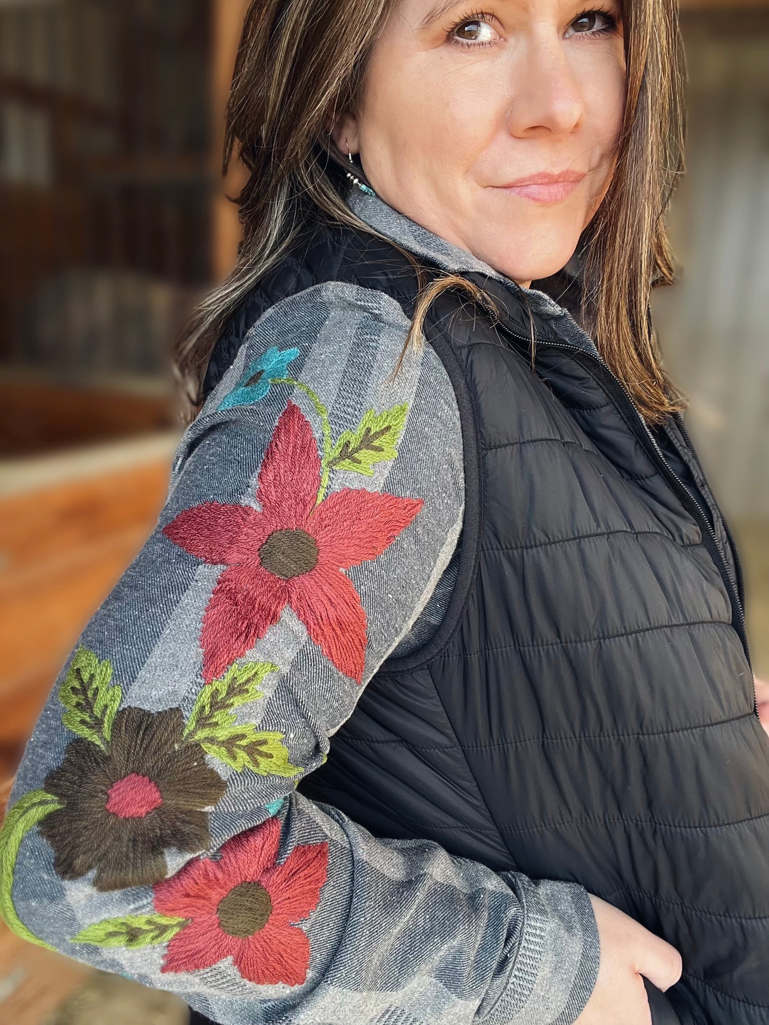 Cozy meets cowgirl in this Western-inspired tunic top by Layerz Clothing Brand. With a nod to the classic chambray denim button up, but made to standout with its rich floral embroidery on the sleeves, & patchwork pockets. The relaxed fit and longer back hem give you effortless comfort with a rustic twist.