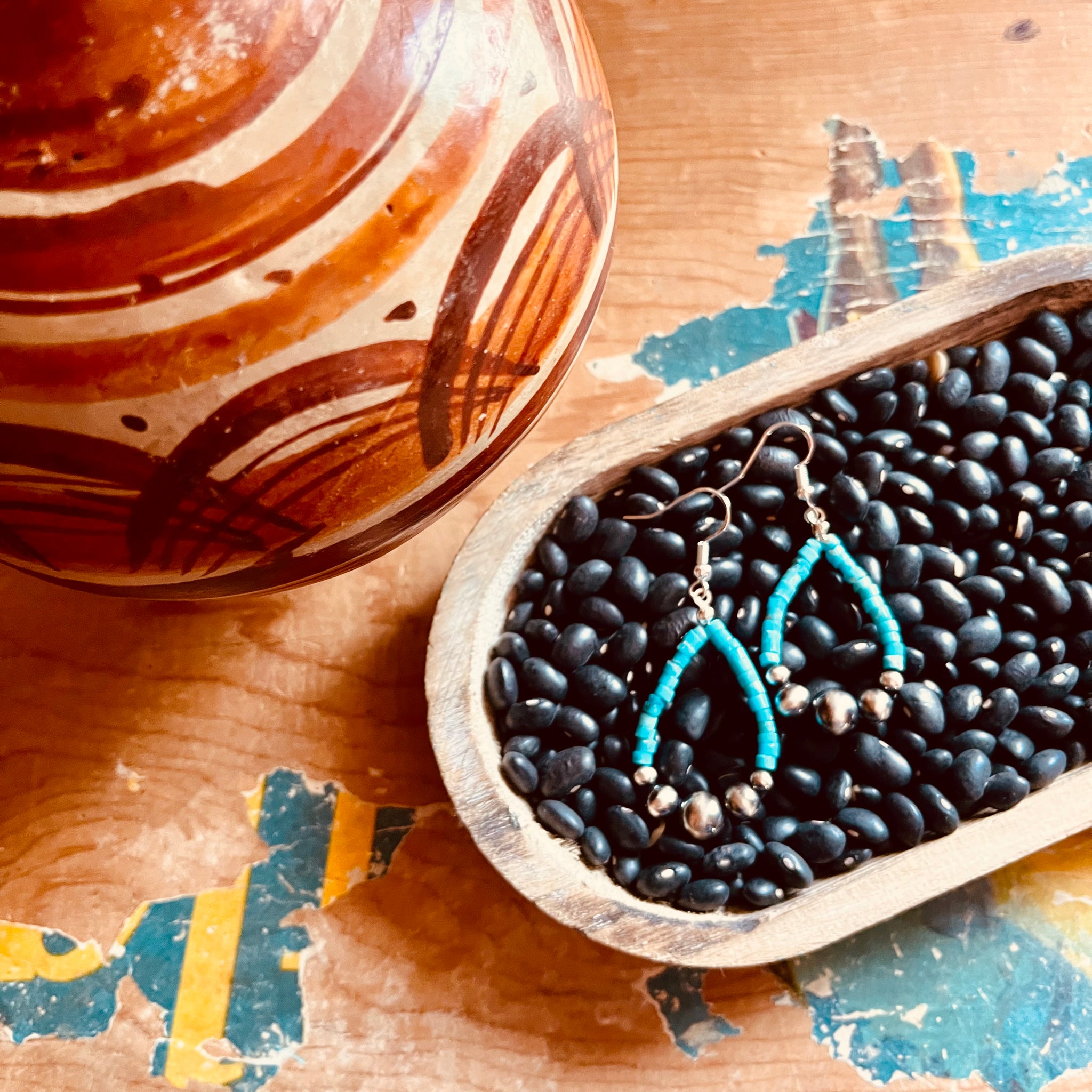 Beautiful, vivid, blue Kingman Turquoise Heshi beads & Sterling Silver Navajo Pearls are the perfect combination! These teardrop earrings are a must for any turquoise lover!