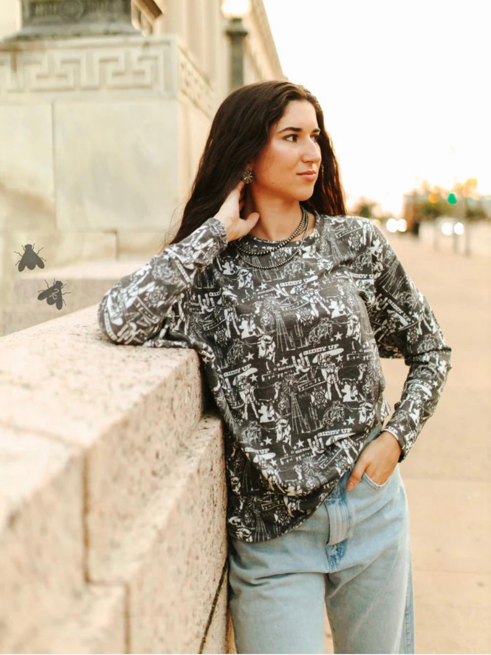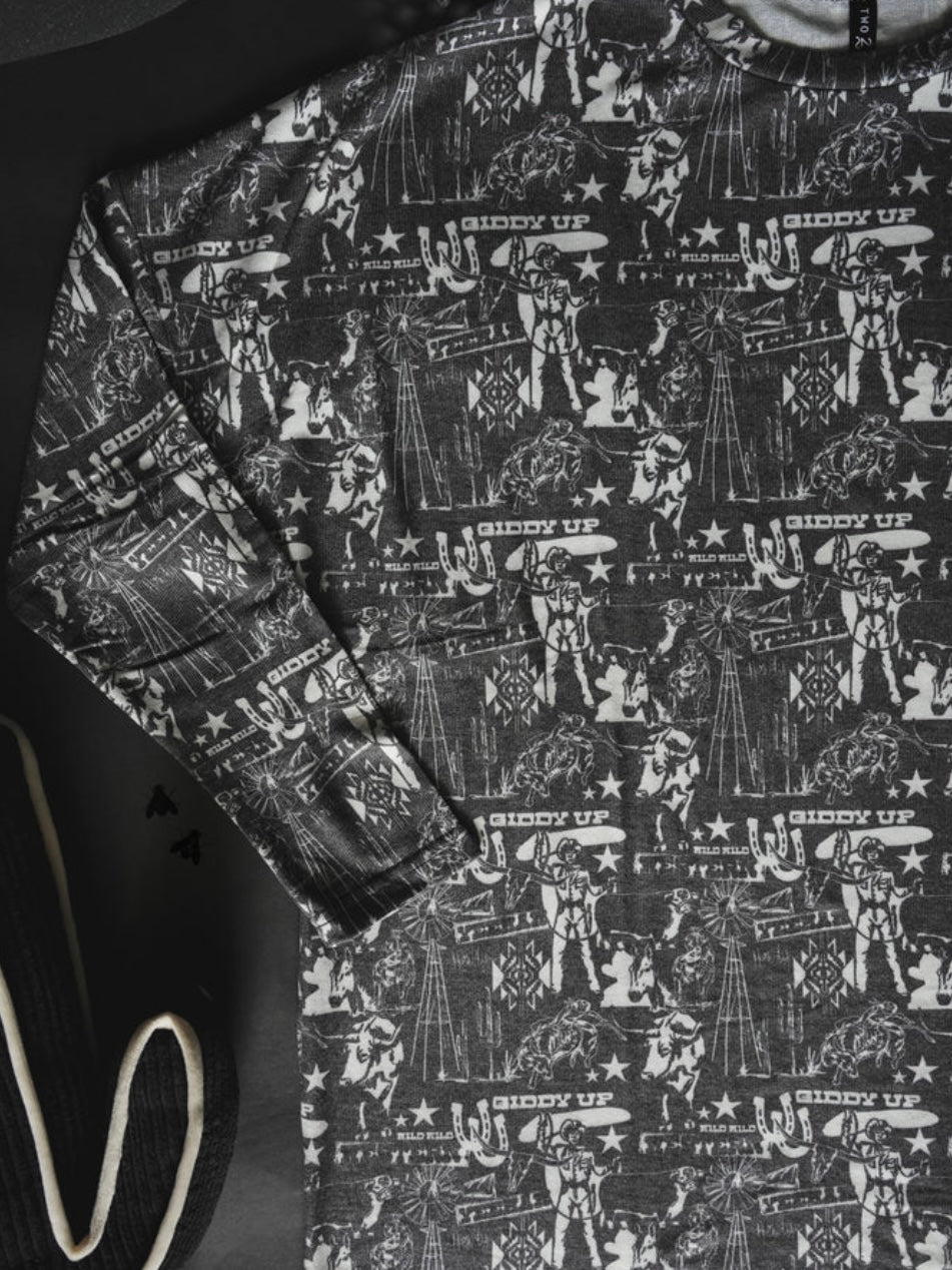 Snag up this relaxed, everybody shape friendly, long sleeve fit... and when you do, zoom in on that pattern.. it's a vintage collage style with all your favorite cowboy things.